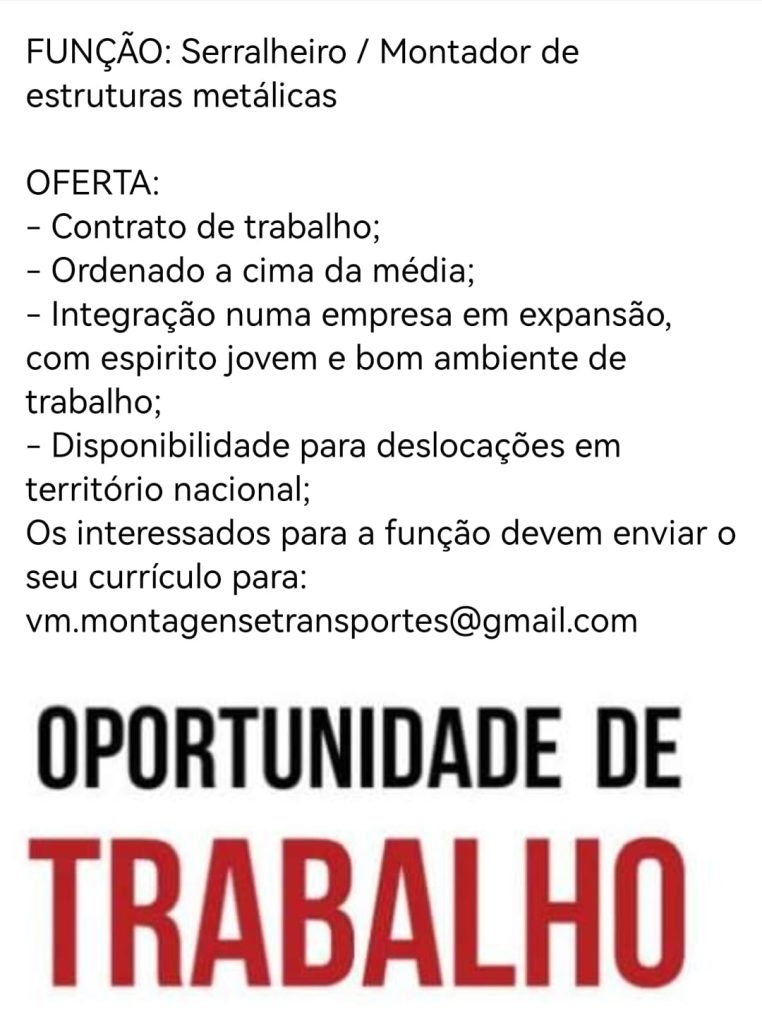 Estamos a recrutar trabalhador para a função de Serralheiro / Montador de estruturas metálicas.